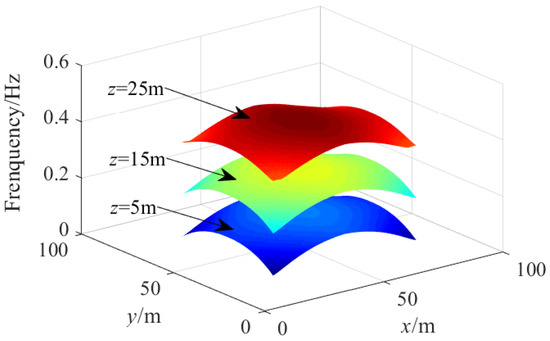 Figure 18 shows the spatial distribution of the first-order natural frequency corresponding to the “ideal point” on three horizontal sections of the workspaces at different heights, i.e., z = 5 m, z = 15 m and z = 25 m. Clearly, the higher the height along the z axis is, the higher the natural frequency is. Since the camera robot belongs to the suspended CDPM, the four pulley points are all above the CPTDS. Therefore, the higher the height along z axis is, the shorter the cable length is. According to Equation (25), the shorter the cable length, the higher the natural frequency of the camera robot. Similarly, there is always a long cable when the CPTDS at one of the four corners of the workspace; hence, the first-order natural frequency of the camera robot will be smaller, leading to a downward sharp corner.