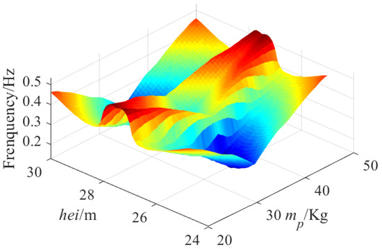 Figure 20 and Table 7 show the relationship of GFNF with the pulley point height and the mass of CPTDS when the optimization variables and are fixed. In this case, and . The relationship between GFNF and is not proportional, but exhibits the characteristics of “high at both ends, low in the middle”. It can be concluded from Equation (21) that the critical factor of determining the GFNF is the length of the cable. On the one hand, the smaller the height is, the smaller the length of the cable is. Thus, the frequency is larger when = 25 m; However, on the other hand, the decrease in height will lead to the decrease in the height of workspace, lead to losing some points in workspace.