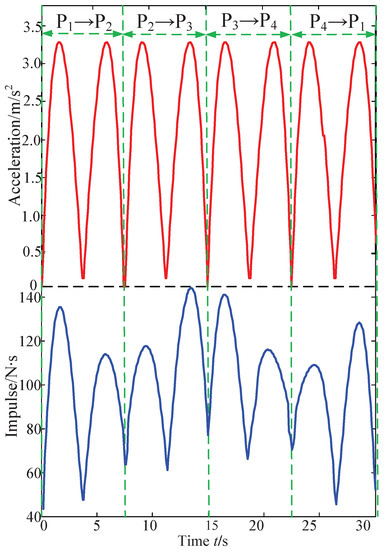 Figure 21 shows the impulse applied on the CPTDS and the accelerations of the CPTDS corresponding to the optimization solution following the sampling locus shown in Figure 11. Since every straight line segment of the locus is planned by a quintic polynomial, the acceleration curve is a cubic curve, and the value of acceleration at each point change motion direction of the locus is 0. It can be seen that the impulse is larger in the time point with larger acceleration, reflecting the tensions exert a large impulse on the CPTDS at this time point. The maximum value appears at t = 15 s, when the CPTDS moves near the point and is close to the lower surface of the workspace.