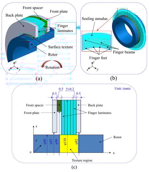 As shown in Figure 1a, the main components of the finger seal include the front plate, front spacer, finger laminates (3~5 layers, and the thickness of each layer is about 0.2 mm), and back plate. As the primary parts of finger seals, each finger laminate is processed into a group of evenly distributed finger curved beams ending with finger feet in the circumferential direction (see Figure 1b). Figure 1c shows the main dimensions of the finger seal. A range of surface textures is evenly distributed on the rotor’s circumferential surface to improve the friction pair’s tribological properties between the rotor and finger feet.