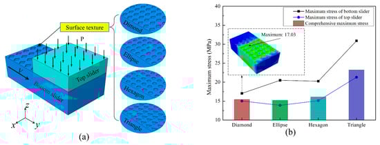 The friction simulation results in Figure 2b show that the maximum stress values of the triangle texture are the largest (the values of the upper and bottom sliders are 21.29 MPa and 30.9 MPa, respectively), whereas the values of the diamond, ellipse, and hexagon textures are relatively smaller. The results of the upper and bottom sliders are given 60% and 40% weights, respectively, for comprehensive evaluation. The comprehensive maximum stress value of the ellipse texture is the lowest (15.21 MPa), followed by diamond (15.42 MPa) and hexagon (16.14 MPa), and the triangle is the largest (23.12 MPa). Therefore, the ellipse, diamond, and hexagon textures with lower comprehensive maximum stress are selected in this paper.