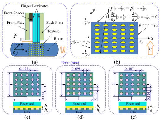 Illustration of finger seal with surface textures: (a) textured finger seal, (b) boundary conditions of the calculation domain, (c) geometrical model of diamond texture, (d) ellipse texture, and (e) hexagon texture.