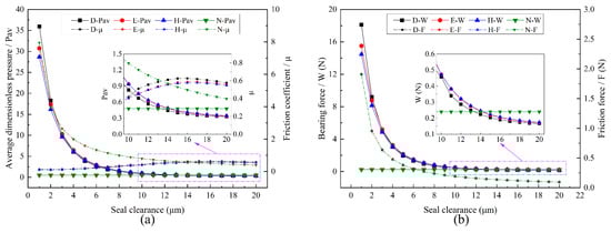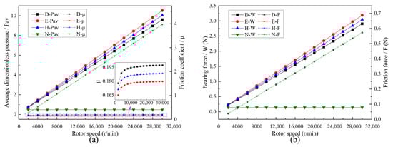Figure 5 shows the change of sealing performance parameters in terms of average dimensionless pressure (Pav), friction coefficient (μ), bearing force (W), and friction force (F) when the ω changes from 3000 rpm to 30,000 rpm. It is noted that D-Pav, E-Pav, H-Pav, and N-Pav refer to the average dimensionless pressure of diamond texture, ellipse texture, hexagon texture, and non-texture respectively, and so on for other legends. In the case of non-texture, as shown in Figure 5a, the μ (i.e., N-μ) increases linearly as the ω increases, whereas the Pav (i.e., N-Pav) remains the same. It can be noted that: (1) the increase of ω does not change the pressure distribution; and (2) based on the definition of hydrodynamic viscosity (i.e., the ratio of viscous shear stress to fluid velocity gradient) and the assumption A6 (i.e., the variations of hydrodynamic viscosity is ignored), the increase of ω leads to the increase of velocity gradient along the Z-direction and correspondingly the shear stress, which results in the phenomenon of the internal F (i.e., N-F) and μ (i.e., N-μ) proportional to ω while the Pav (i.e., N-Pav) and W (i.e., N-W) constant.