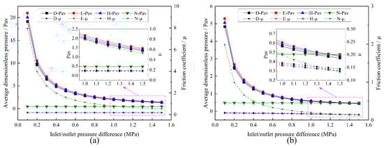 Effect of pressure difference on average dimensionless pressure and friction coefficient: (a) 20,000 rpm and (b) 5000 rpm.