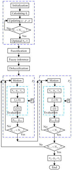| 7: Evolving the population based on (21); replacing the global best () and personal best () particle positions. |