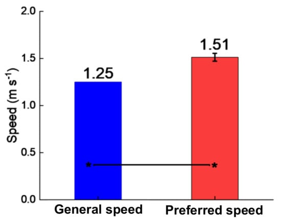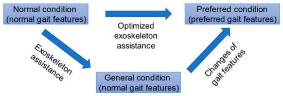 The walking session was divided into four conditions: walking at 1.25 m/s without assistance (normal condition) and with assistance (general condition) and walking at preferred speed with assistance (preferred condition) and without assistance (comparison condition). The normal condition represents the free walk under the preferred speed 1.25 m/s. The general condition represents walking with assistance without considering the changes (1.25 m/s) in preferred speed. The preferred condition represents walking with assistance when taking the changes of preferred speeds into consideration. The comparison condition represents the free walk without assistance at the preferred speed of the preferred condition. Sufficient rest intervals were set between every session to eliminate the effect of fatigue.