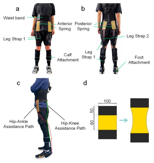 The exoskeleton was made of commercially available resistance bands (TheraBand Professional Latex Resistance Band Gold, TheraBand, Akron, OH, USA), nylon fabric and waist bands, which led to a lightweight device. The three main parts (waistband, hip-ankle assistance path and hip-knee assistance path) and the deformation of springs are shown in