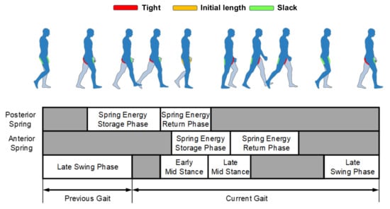 Figure 3). For the hip-knee assistance path, the elastic energy is stored from the late swing phase and then released in the coming movements. While for the hip-ankle assistance path, the elastic energy is stored from early mid-stance to heel-off, and then released gradually after heel-off. The details of the assistance are not presented here as this is not the main focus of this article.
