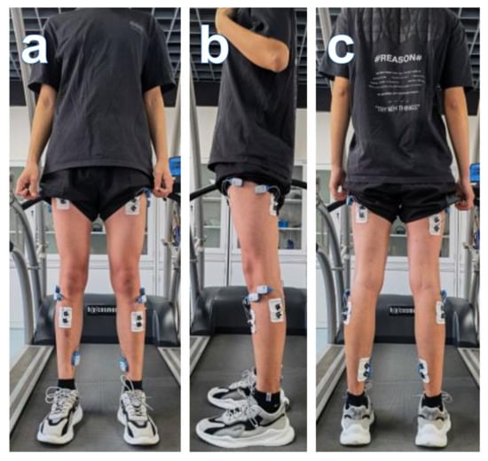 Figure 4). The signal was filtered by a low-pass filter at 10 Hz and a high-pass filter at 500 Hz. Surface electrodes were placed bilaterally in a bipolar configuration over six muscles—gluteus maximus (GMAX), rectus femoris (RF), biceps femoris (BF), lateral gastrocnemius medialis (GAS), soleus (SOL) and tibialis anterior (TA). Before placing the electrodes, the body hair was shaved and then the corresponding area was polished with sandpaper and alcohol cotton balls. When placing the transmitters, it was important to notice the interference with the wearable device and overlap with corresponding antagonistic muscles to avoid large measurement errors. All manipulations were performed by experts that specialized in surface EMG measurements. The calf was wrapped with knee-length stockings and the thigh was covered with textiles to prevent the transmitters from being thrown off at fast speeds.