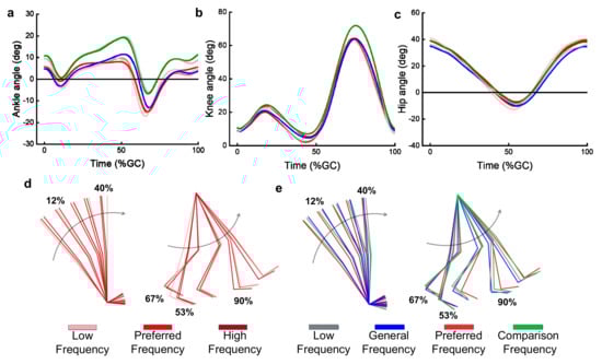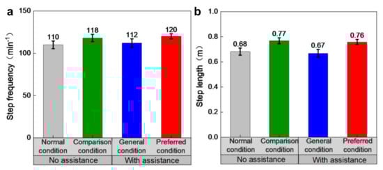 The treadmill speed was set at the self-selected speed constantly under the same condition in the walking session. At the beginning of a walking session, participants walked on the treadmill under their preferred gait features. The preferred frequency was obtained from the gait cycle duration, calculated by recording 20 steps. Then, participants walked for a 4-min trial following the metronome with ±10% of the preferred step frequency, respectively. Procedures were the same in conditions of walking at 1.25 m/s with and without assistance. The trial for walking at the preferred assisted speed without the device was only performed once at its preferred step frequency as the comparison condition.