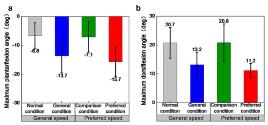 Speed has great effect on the step frequency and step length, and significantly improves them under the same assistance condition. There were only negligible differences between different assistance conditions at the same speed. However, it is still possible that there is a complicated relationship between the exoskeleton assistance and the step frequency and length, as the corresponding changes in preferred gait features are related to the increased speed that is caused by the assistance. Effects of the exoskeleton on the ankle joint angle lasted throughout the gait cycle, especially during the plantarflexion and dorsiflexion phases, and the exoskeleton significantly decreased the dorsiflexion angle and increased the plantarflexion angle. However, the effect on knee and hip angles was not significant, only during the swing phase there was more flexion of the knee angle under assistance. There was no significant difference in the angular range of all the lower extremity joints under different walking conditions. Especially for the ankle joint angle, although the maximum plantarflexion and dorsiflexion angles changed due to the assistance of the exoskeleton, these curves were almost only translated up and down. These results suggested that there were no obvious changes in walking features. These results demonstrated that the effect of exoskeleton on walking kinematics is limited and did not significantly alter walking habits.