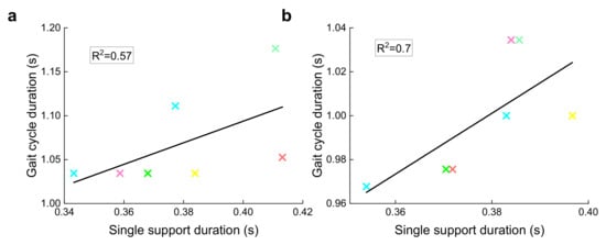 A higher correlation between the single support duration and gait cycle duration was shown under the preferred condition (R