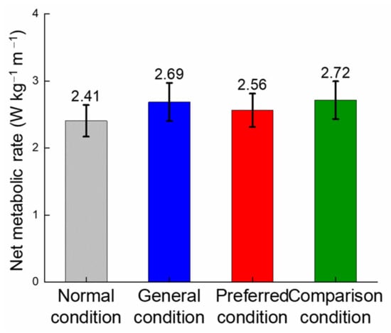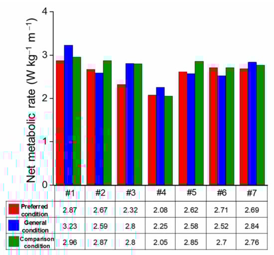 Unexpectedly, the net metabolic rate under the general condition showed a totally different result insofar as only one participant had a reduction of 0.59%. Since the gait feature is almost the same, the increase between the normal and general condition can be explained by the device’s characteristics such as unpowered and multi-joint-assisted. On the contrary, the net metabolic rate of the preferred condition showed a positive effect on energy saving, with 6 of 7 participants having a reduction on their net metabolic rates compared to the comparison condition. The difference between these two trends suggested the great effect of preferred speeds on assisting results. In addition, a 4.53% reduction was found between the preferred and general condition; 4 of 7 participants under the preferred condition showed a reduction in net metabolic rate with respect to the general condition. The increased net metabolic rate of the general condition is similar to the result in [