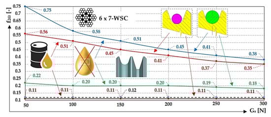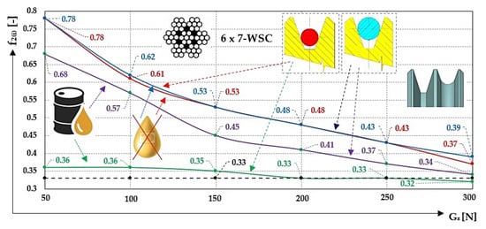 13], when checking the traction capability in case of “cage loading and emergency braking” or in case of “standing balancing weight”, are the minimum, value of all values possible in practice. Lower values of the coefficient of friction were achieved at higher values of the tensile force acting on the approaching side of the rope from the driving rope sheave. Higher values of the friction coefficient were used to show measurements carried out on a laboratory machine when the contact surfaces condition for the rope sheave groove and the rope surface was dry and clean. The lowest values of friction coefficient were calculated when the contact surfaces of the sheave groove and rope surface were contaminated with oil. In practice, this operating condition is defined by a lubricant which is extruded from the fibrous rope core, or by a lubricant that is applied to the rope surface to limit the corrosion of wires.