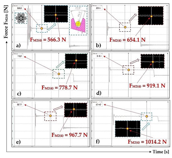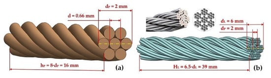 Table 4). This deviation can be caused by several factors, e.g., by simplifying the geometric model, in which the wound strands of the rope were simplified to simple wires with a circular cross-section, infill wires were neglected, and also all inaccuracies that are present in reality have been eliminated. Furthermore, the exact material parameters of the tested rope were not used in the calculation, but these were based on [