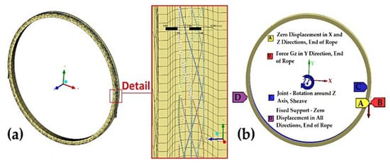 41]. For the finite element model, the strands of a rope are considered to be beams, which can also influence the result. The above-mentioned limitations of the model thus can cause, both alone and in combination, a deviation from the real values. Nevertheless, the calculated values are significantly closer to the experiment than to the values given by a relevant standard.