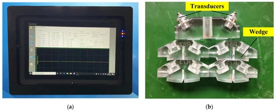 Figure 1a shows the ultrasonic residual stress detector developed by Beijing Institute of Technology. Additionally, the system uses the cross-correlation algorithm written in C++ language, which brings the detection accuracy within ±20 MPa. In order to test the curved and flat areas of the outer ring components, the bottom of the detection wedge is machined to fit closely to the curved and flat surfaces, as shown in Figure 1b.