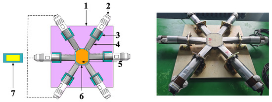 USR system: 1 is Support foundation, 2 is Ultrasonic transducer, 3 is L-shaped fixed plate, 4 is TC4 horn, 5 is Support wood block, 6 is Outer ring component, and 7 is Ultrasonic power.