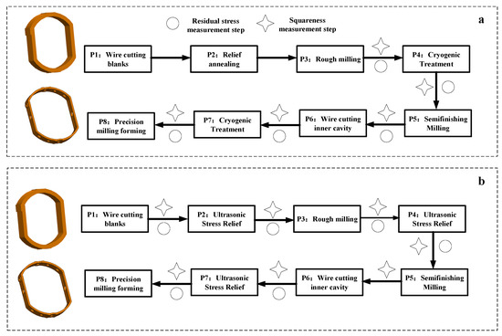 Detection and residual stress elimination process of outer ring components. (a) traditional machining process of TC4 thin-wall outer ring; (b) ultrasonic machining process of TC4 thin-wall outer ring.