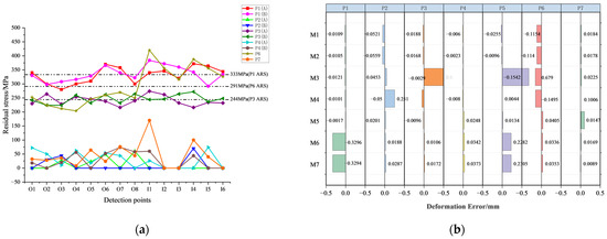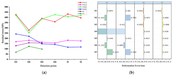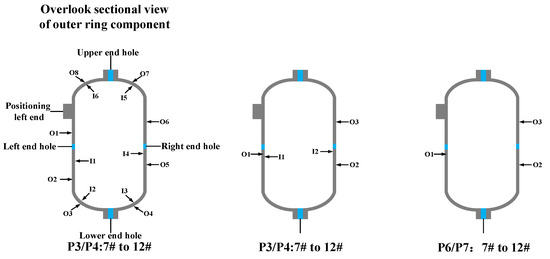 Residual stress detection points and three-dimensional measurement dimensions are shown in Figure 4a,b respectively. M1 to M6 are the difference between the detection value and the design value, and M7 is vertical. In the P3/P4 detection, the left convex platform of the outer ring component is used as the detection positioning reference. Four regions near the position of the outer borehole and two regions inside are selected for stress detection. The position below the detection surface is denoted as A, and the position above is denoted as B. As the inner ring is slotted and the detection space is limited, it can only detect three locations outside during P5 and P7.