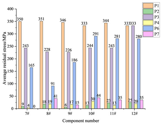 The average residual stresses (ARS) of components (from 7# to 12#) after different processes are shown in Figure 8. The stress distribution trends of the six components are roughly the same. In the forming process, the maximum residual tensile stress distribution is introduced when the components cutting frame from the round billet. Except for 10# and 11#, the residual stresses of other components after rough milling are larger than those after wire cutting.