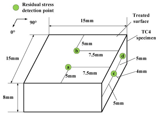 Two test blocks prepared by wire cutting on TC blanks are recorded as A and B test blocks, as shown in Figure 11. Due to the small size of the test block, LCR wave method cannot be used to measure residual stress, so an X-ray detector is used to detect stress at local points. Two points (a/b) in the center of the treated surface and the center of thickness (c/d) were selected for residual stress measurement. Firstly, the stress of the original test block was measured, and then the two test blocks were placed directly at the front end of the 20 KHz transducer for pressing, and ultrasonic stress relief was performed: among them, the A test block received ultrasonic treatment, for 5 min and the B test block received ultrasonic treatment for 10 min. After the treatment was complete, the residual stress of the test block was detected again.