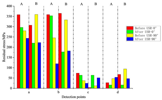 As shown in Figure 12, before ultrasonic treatment, the stress at points a and b of blocks A and B was large, and the stress at points c and d was small. The overall stress after USR was significantly reduced, which was consistent with the test results of Gu et al. [35]. After 5 min of ultrasonic stress treatment, A block in the 0° direction from a point to d point stress are reduced, but the decline is not large. In the 90° direction, only the stress at point d increases from 43.1 MPa to 53.9 MPa, which should be caused by the stress balance. Similarly, the stress of a, b and d points with larger stress in 0° and 90° direction of B block decreased significantly after 10 min ultrasonic stress relief treatment. The initial stress at point c is only 3.9 MPa and 12.5 MPa. When the stress of the whole component decreases, the stress at c increases to balance the overall internal stress. The two points of c/d are located at 4 mm depth below the regulated surface, i.e., at 1/2 of the overall thickness. The change in stress also indicates that the USR not only reduces and homogenizes the stress on the regulated surface, but also changes the stress of the whole component.