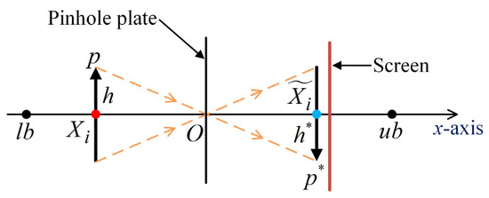 Pinhole imaging is a common optical phenomenon that specifically refers to when the light source passes diagonally from one side of the pinhole plate into the other side, an inverted image will be formed on the receiving screen at this moment. As illustrated in Figure 3, where the cardinal point denotes the midpoint of the search range and the -axis is considered as a pinhole plate. Additionally, a light source with height is placed at the point ( is the current location of the -th search agent in the population). Through pinhole imaging, the corresponding image with the height can be obtained and its projection on the coordinate axis is ( is the opposite position of ). The geometrical relationship in this figure is formulated as follows: