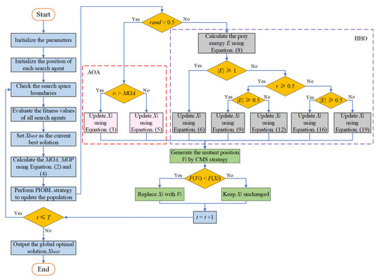 | 1. Initialize the population size and the maximum iterations 2. Initialize the positions of each search agent 3. While 4. Check if the position goes beyond the search space boundary and then adjust it 5. Evaluate the fitness values of all search agents 6. Set as the position of current best solution 7. Calculate the value using Equation (2) 8. Calculate the value using Equation (4) 9. Generate the opposite positions of all search agents using Equation (21) and save the ones with better fitness//PIOBL 10. For to 11. If then //AOA is a random number between 0 and 1 12. If then 13. Update the position using Equation (3) 14. Else 15. Update the position using Equation (5) 16. End If 17. Else //HHO 18. Calculate the prey energy using Equation (8) 19. If then 20. Update the position using Equation (6) 21. End If 22. If then 23. If and then 24. Update the position using Equation (9) 25. Else if and then 26. Update the position using Equation (12) 27. Else if and then 28. Update the position using Equation (16) 29. Else if and then 30. Update the position using Equation (19) 31. End If 32. Generate the new mutant positions by using Equations (24)–(26) //CMS 33. Set as the best trial vector with the lowest fitness from 34. If then 35. 36. End If 37. End If 38. End For 39. 40. End While 41. Return |