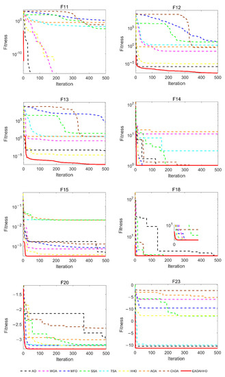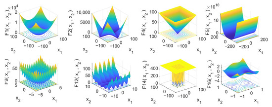 In this subsection, a total of 23 classical benchmark functions selected from the literature [27] are utilized to evaluate the performance of EAOAHHO. The 23 benchmark functions are classified into three different categories on the basis of their features: unimodal, multimodal, and fix-dimension multimodal. The unimodal benchmark functions (F1~F7) have only one global optimal value and are usually applied to check the exploitation competence and convergence rate of the algorithm. On the other hand, the multimodal benchmark functions (F8~F13) are characterized by multiple local minima. This type of functions is designed to examine the exploration capability and the local optima avoidance of the algorithm. The fix-dimension multimodal benchmark functions (F14~F23) can be regarded as a combination of the first two categories of functions but with a lower dimension, and they are used to study the stability of the algorithm between the exploration and exploitation. The expression, spatial dimension (Dim), search range, and a theoretical minimum of each function are outlined in Table 2, Table 3 and Table 4. Figure 5 visualizes the search space of some representative benchmark functions.