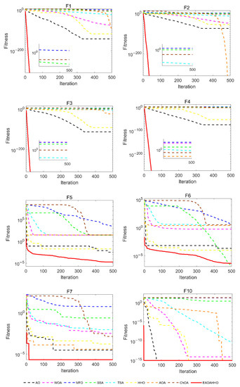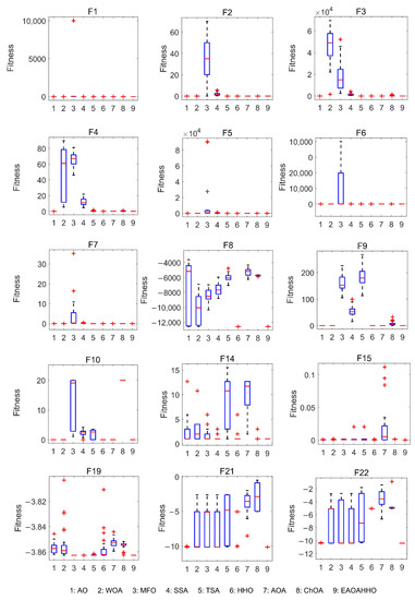 Computational complexity is a vital metric to measure the time consumption of an algorithm during operation. The computational complexity of the proposed EAOAHHO is mainly associated with three components: initialization, fitness evaluation, and updating of positions. In the initialization phase, the positions of all search agents are generated randomly in the search domain, which needs computational complexity , where is the population size. Then, in the iteration procedure, the algorithm evaluates the fitness value of each individual and updates the population positions sequentially, so the computational complexity is , where denotes the maximum number of iterations and denotes the dimension of specific problems. In addition, PIOBL and CMS are introduced in the proposed algorithm to further update the position vector of each individual. The computational complexity of the two strategies is and , respectively. Thus, the total computational complexity of EAOAHHO should be . As per the literature [27,38], the computational complexity of both AOA and HHO is . In addition, the complexity of all other algorithms (AO [28], WOA [31], MFO [48], TSA [49] and ChOA [50]) used in this paper is . Compared to the basic algorithms, the computational complexity of EAOAHHO increases to some extent. However, these extra time cost can significantly improve the search performance of the algorithm and acquire a better solution, which is acceptable based on NFL theory.