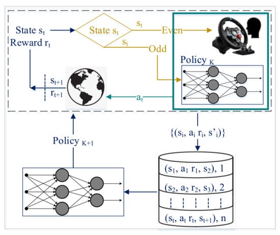 - Mnih, V.; Kavukcuoglu, K.; Silver, D.; Rusu, A.A.; Veness, J.; Bellemare, M.G.; Graves, A.; Riedmiller, M.; Fidjeland, A.K.; Ostrovski, G.; et al. Human-level control through deep reinforcement learning. Nature 2015, 518, 529–533. [Google Scholar] [CrossRef] [PubMed]