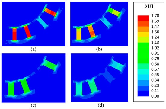 FEA simulation results showing magnetic flux density in adjacent stator stems, simultaneously excited (300 A-t), as functions of stem diameter: (a) d = 10 mm, (b) d = 12 mm, (c) d = 14 mm, (d) d = 16 mm.