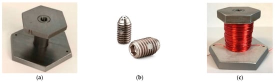 Prior to winding, the stems and plates of each stator pole were lined with 0.25 mm insulation (CG100 Fish Paper, 145PTags.com, Maitland, FL, USA) to prevent abrasion and shorting of the magnet wire. Each stator pole was wound with 522 turns of 24 AWG magnet wire (Remington Industries, Johnsburg, IL, USA), with a tabletop CNC milling machine (Sherline 2000, Vista, CA, USA) and a custom 3D-printed fixture. Two small holes (2 mm diameter) drilled into the bottom plates of each stator pole allowed the winding terminations to pass through the bottom plate of the stator pole to electrical terminations outside the stator housing. A photograph of a completed regular hexagonal pole is shown in Figure 4c.