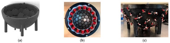 A hemispherical stator housing (Figure 5) was designed to maintain support and proper spacing for the 46 stator poles and organize the phase conductors. This housing (Figure 5a) was 3D printed using fused deposition modeling (F370, Stratasys, Eden Prairie, MN, USA) with ABS material. The stator poles were secured into the housing using a top ring assembly and M6 bolts (Figure 5b). Through-holes in the housing (92 total) enabled external stator phase connections (Figure 5c).