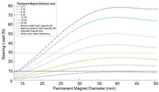 Grade N42 neodymium-iron-boron magnets (NdFeB) were selected for the rotor, based on their extremely high energy density (42 MGOe) and widespread availability in common shapes and sizes. To optimize their size, number, location and polar orientations, magnetostatic simulations were performed using FEA software (ANSYS Electronics Desktop, Canonsburg, PA, USA). These simulations helped balance the tradeoffs between motor torque and normal bearing loads. Figure 6 illustrates the relationship between magnet size and normal bearing load for maximum stator pole excitation (300 A-t).