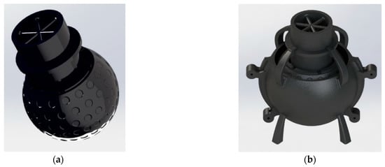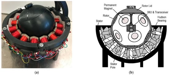 The PMs were secured to the inner rotor bowl (Figure 9a) using an adhesive epoxy (Clear Multi-Purpose, Loctite, Düsseldorf, Germany). The rotor lid houses the IMU, the RF transciever module (Digi International, MN, USA), and associated electronics. The rotor bowl and the lid are assembled with an interference fit to form a complete sphere. The final PMSSM prototype, detailing the fully assembled rotor and stator sub-assemblies, is shown in Figure 10.