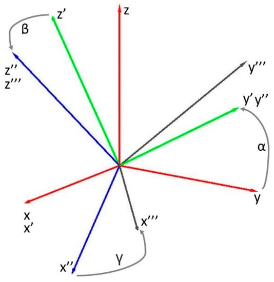To enable orientation control, the rotor orientation and the orientation error must be defined. The 3D orientation of the PMSSM can be represented using Euler angles; the device’s rotation about three orthogonal axes is represented by angles α, β and γ, as shown in Figure 11.