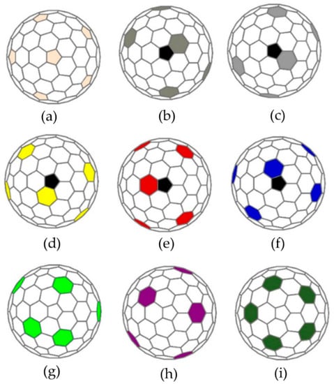 Goldberg polyhedron (3,0) used as the basis for PMSSM stator design. Highlighted are the fundamental geometries: pentagon (12 total), regular hexagon (20 total) and irregular hexagon (60 total).