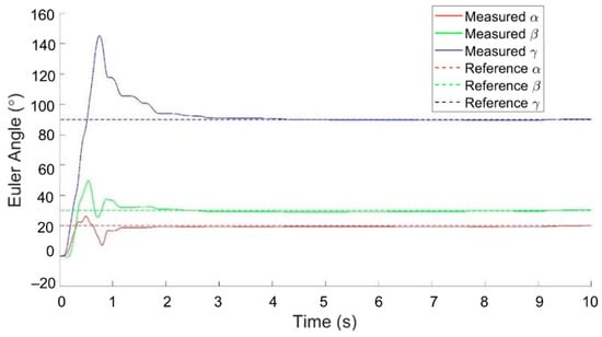 Subsequently, the step response of the PMSSM was evaluated using step commands of 20°, 30° and 90° for the α, β and γ angles, respectively. Figure 14 shows the response of the PMSSM to the step input. The steady state errors were 0.25°, 0.44° and 0.16° for the α, β and γ angles, respectively. The data were collected with MATLAB (Mathworks Inc., Natick, MA, USA) from the MCU using serial communication with a sampling rate of 50 Hz.