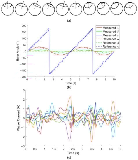 Separate testing was conducted to track time-varying references about multiple axes. The reference trajectory for α was sinusoidal, with an amplitude of 30° and a frequency of 72°/s, while the reference for γ was a ramp with a slope of 72°/s. The setpoint for β remained fixed at 0. Figure 15a provides snapshots of the first 5.0 s of this rotor reference trajectory. Figure 15b shows the tracking performance for the time-varying reference. The average absolute tracking error was 3.10°, 3.94° and 6.38° for α, β and γ, respectively, while the maximum tracking error was 10.56°, 19.70° and 14.30°. The associated phase currents are shown in Figure 15c. Phase currents were saturated at 1.5 A to prevent damage to the phase windings.