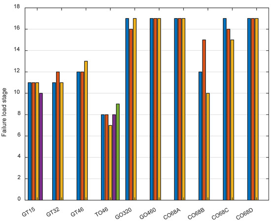 Figure 4, for all gas turbine oils, gear oils and turbine oils there is a difference between the minimum and maximum failure stage of ± 1. Only for a circulating oil is there a difference of five points, and in this case, it was not possible to assign a failure stage. Presumably, this is due to the different additives’ presence in the lubricant, and this variability is assumed to be caused by chemical phenomena that require more detailed analysis. Finally, of the products tested, only one did not demonstrate good repeatability.