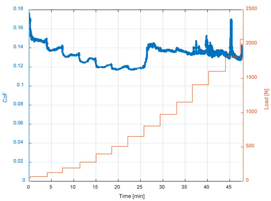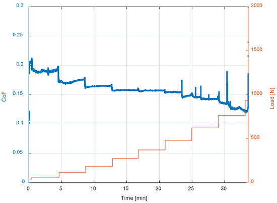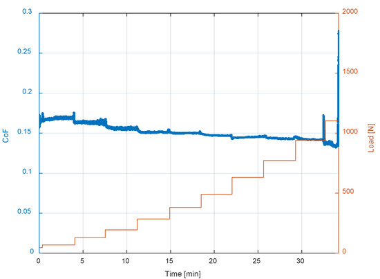 Figure 8, where a special and unique case can be highlighted. In the middle of the test, the CoF profile changes, becoming flat and reaching high values as in the first steps. This behavior has occurred quite exactly in all the test repetitions.