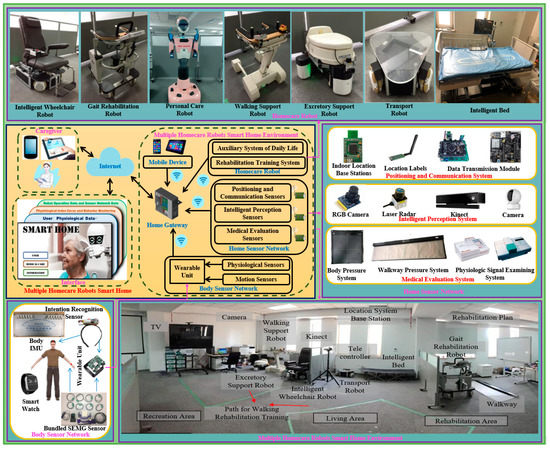 There are several studies of smart homes integrated with robots and sensor networks for elderly care; however, they all have limitations in functionality, security, and service continuity. Therefore, based on the original system [25], we optimized the gateway and added two kinds of nursing robots, namely intelligent bed, and personal care robot. The MNSH, as shown in Figure 1 integrates a smart home, seven nursing robots, sensor network, and data management system so as to contribute to raising the living standards of the elderly. The overall technology of MNSH can be applied not only to families but also to hospitals and pension centers. Compared with previous studies [22,32,33], MNSH focuses on behavioral assistance that is closer to life.