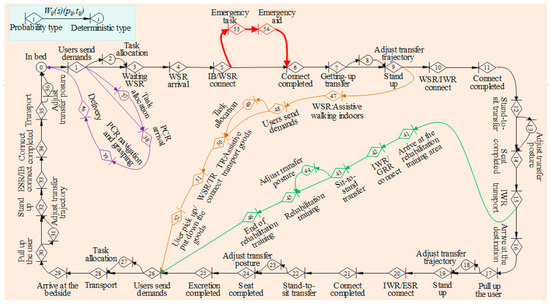 Based on the basic task unit divided by the central control layer, the model of continuous nursing tasks that occur frequently in elderly care was established. In this paper, we took a continuous auxiliary task as an example, and the graphic model of the nursing process is shown in Figure 3 (First, get up, move indoors and drink water, then conduct excretion, and finally go back to bed). Nodes represent different states in performing nursing tasks, and activities represent the transfer relationship between states, that is, the execution process of activities, including the execution time and occurrence probability of activities. The quantitative relationship is expressed by the transfer function , where is an arbitrary real number. The value is the probability that activities will occur under the condition that the state of the leading node is realized, and is the execution time of the activity . The different models of nursing processes can be combined and deduced based on these task units and task parameters according to actual needs. The activities corresponding to each task, required robots, and priorities are shown in Table 2. According to the types of tasks, the priority of each task is set to a value between 0 (highest priority) and 4 (lowest priority). All high-priority tasks should be assigned before low-priority tasks. In the whole nursing process, users may change their demands momentarily, and there may be emergencies in the environment at any time. Therefore, the updated model of the nursing process realizes multi-step planning by inserting a task chain composed of multiple task units. When the user has new demands or an emergency suddenly occurs during the execution of the task, the original model is inserted into the new task chain from a suitable time point. The insertion time point needs to be determined according to the task allocation method and task priority. We assume that the user has some mobility and csn walk with robot assistance in the case of Figure 3, but cannot perform some tasks in daily life alone, such as moving indoors and getting up.