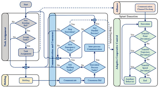 According to the proposed bidding calculation scheme, we based the overall decision-making process on the task allocation process, as shown in Figure 4. At the beginning of task allocation, the user’s demands are first decomposed into a series of interdependent subtasks, at which time all robots can be called. If the robot bid for a subtask, it enters the stage of communication and consensus. If a robot bid higher for a subtask than other robots, it comprehensively decides whether the robot can get the subtask according to the current bidding information of the task and the current state of the robot in the task assignment stage. When all subtasks of a complex task are assigned to corresponding robots, these robots form a static alliance according to the information of the task assignment to complete one complex nursing task. When the robot completes the execution of the current task, the robot bids for the next subtask in parallel with the same process. If a new nursing task is added to the system at the above stage, it is divided into two situations. The first situation is that the new task is included in all tasks and is bid for by the robots together. In the second case, if the newly added task has an urgent priority, all robots that perform lower priority tasks at the current stage stop their tasks. When a robot stops executing task , the robot enters a new bidding process, at which time the task abandoned from execution can be re-bid. This ensured that urgent nursing tasks are carried out in time. When the robot alliance is established, the robots in the group assist the users’ transfer behavior, based on the adaptive cooperative control method. The auxiliary process needs to meet the preset transfer information, including transfer point, transfer speed and transfer trajectory, to ensure the safety of the whole auxiliary process.