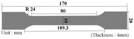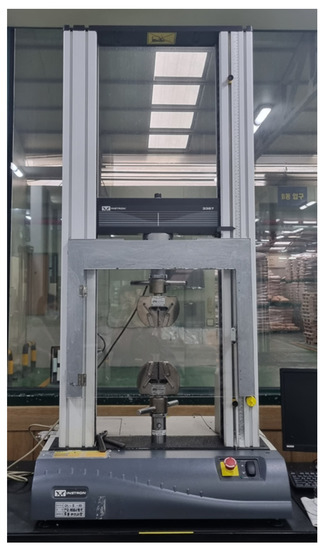 Tensile strength was tested according to the ISO 527/1A/50 test standard [18,19], and an Instron Universal Testing Machine (UTM) was utilized as the test device. The equipment and specifications are shown in Figure 1 and Table 2, respectively, and the test specimen (type 1A) is presented in Figure 2.