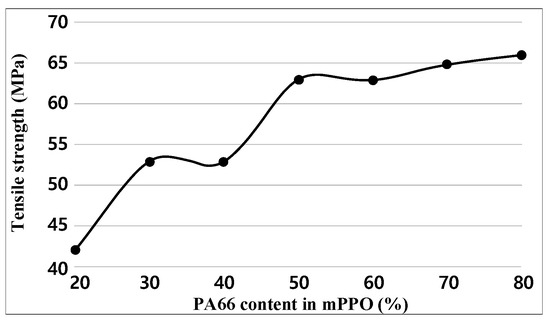 For each sample, tensile tests were performed five times. Figure 3 and Table 3 indicate the test results of tensile strength. The experimental results show that the tensile strength increased as the PA66 content increased. In particular, drastic increases in tensile strength occurred when the PA66 content was up 50%, after which the increment decreased.