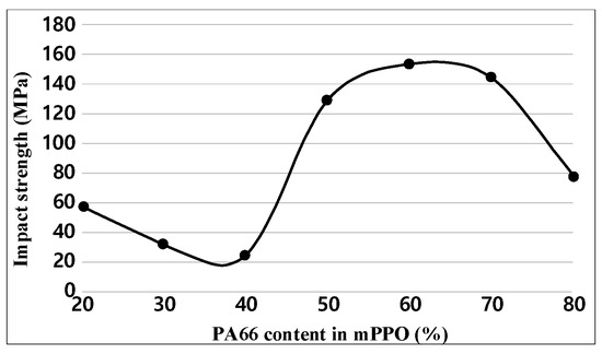 For each sample, impact tests were performed five times. Figure 6 and Table 6 show the test results of impact strength. The experimental results indicate that the impact strength decreased as the content of PA66 increased and then drastically increased after the PA66 content reached 50% or more. However, the impact strength decreased when the PA66 content was 80%, showing a relatively higher strength than when the PA66 content made up 20–40%. In general materials, tensile and impact strength have an inverse relationship. However, in the case of composite materials, the material characteristics vary depending on the contents of materials that are to be blended for each alloy, the difference in miscibility, or the interfacial force between molecules. Therefore, the inverse relationship between tensile and impact strength does not always hold. A related reference has been added [21]. Accordingly, it is predicted that the above tensile strength results and the tendency of impact strength results do not match.