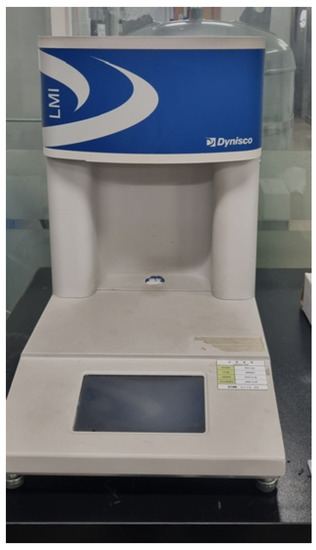 The MFI was tested according to the ISO 1133 standard [22], and the melt flow indexer (Tinius Olsen) was utilized as the test equipment. The equipment and specifications are presented in Figure 7 and Table 7, respectively. The operation temperature for the experiment is 275 °C.